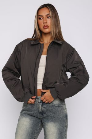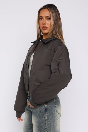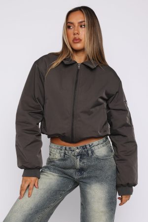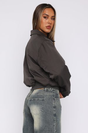 The Something Forgotten Bomber Jacket Slate is the on trend jacket you need to welcome in fall! Features a cropped length. drop shoulder design. semi oversized. structured collar and a thick fabrication with lining. Keep it on trend with a low rise jean. sneakers and shades for a super cute look!