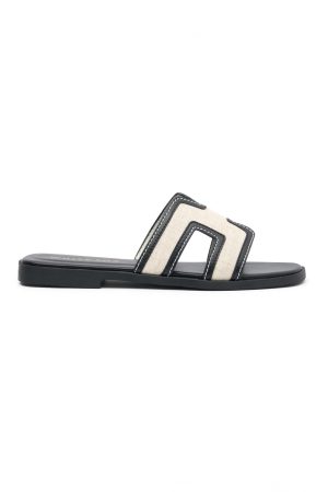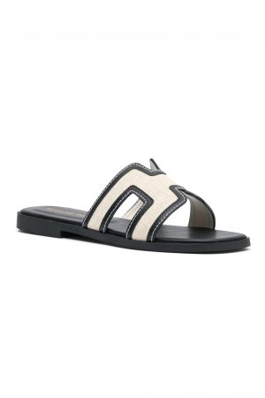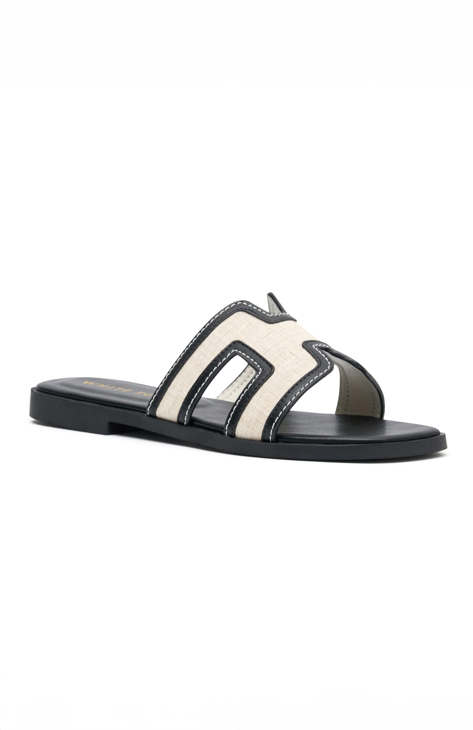 Slip your sun-kissed feet into the Sophia Canvas Sandals Black/Natural! Features an open squared toe. single wide strap with natural fabrication detailing. slip on design and flat sole.