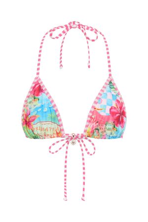 Stand out in the Sorella Beaded Bikini Top Island Time. This chic triangle bikini top combines thin halter straps with beading and a triangle silhouette enhanced by sun charm hardware at the center front. The adjustable back strap ensures a custom fit. Perfect when paired with the matching Island Time bottoms and your favourite sunnies for an effortlessly polished beach look.