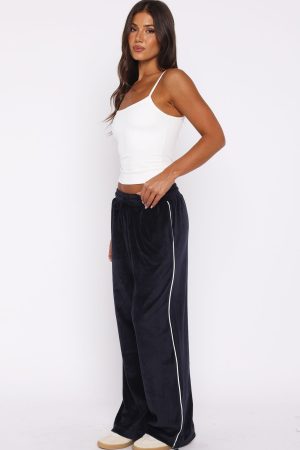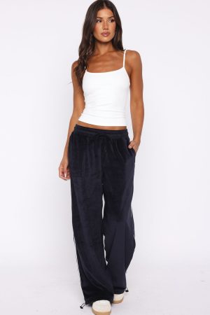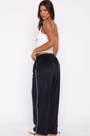 Ignite your street style with the Soul Fire Pants in Navy. Crafted from velour fabrication these pants feature a thick elasticated waistband with an external drawstring for a customizable fit. The bold stripe detailing along the sides adds a sporty edge. while the wide-leg silhouette ensures comfort. Adjustable toggles at the hem allow you to personalize the fit. and the unlined. super-soft fabric keeps you comfortable. Style with a basic tank and your fav sneakers for effortless fashion.