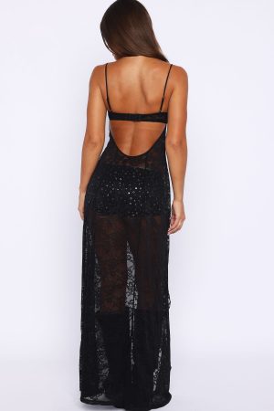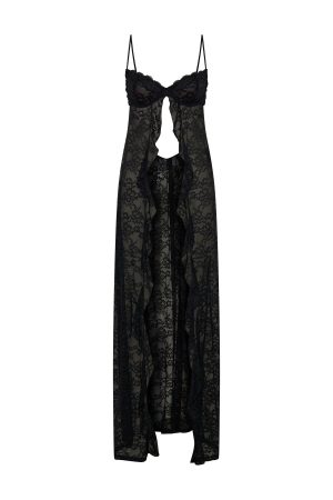 Switch into festival mode with the Sound Waves Top in Black. Designed to turn heads. it features thin adjustable shoulder straps and under‑wire bust cups and delicate lace‑trimmed neckline. The adjustable back with hook‑and‑eye closure ensures a custom fit. and the fully lined. front‑split silhouette crafted in floor‑length sheer lace fabrication. Pair with the Festival Feels Embellished Shorts for a bold. dance‑ready style.
