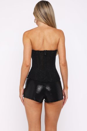 Make a dazzling entrance in the Spotlight On Me Strapless Bustier Black Glitter! Featuring a strapless neckline. structured internal boning for sculpted support. ultra‑shimmer fabrication. fully lined for comfort. and a sleek invisible back zipper with hook‑and‑eye closure for a perfect finish. Style it with our mini Shorts. heels and layered gold jewellery to light up the dancefloor.