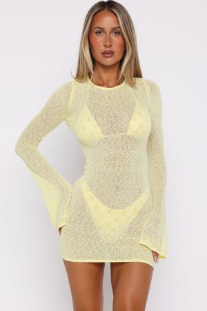 Turn heads with the Stand And Stare Long Sleeve Mini Dress in Lemon. Crafted from a stretch-knit fabric that’s slightly sheer. this mini dress features a high neckline with long sleeves and a daring low back for a subtly sultry silhouette. Pair with a matching lemon bikini for a fit that transitions beautifully from beach cover-up to sunset soirée.