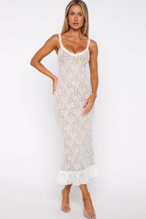Elevate your look with a hint of Parisian grace. The Stand For Something Lace Midi Dress White features delicate elastic straps trimmed with lace. a soft V‑neckline accented with a dainty bow. an underbust seam for shape. and a figure‑hugging silhouette that flares into a frilly hem. Fully lined and crafted in lace. It’s ideal for pairing with heels and layered jewellery for a refined. romantic statement.