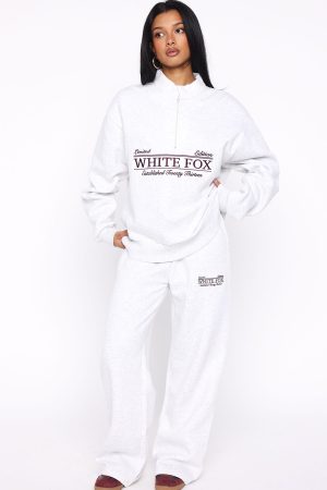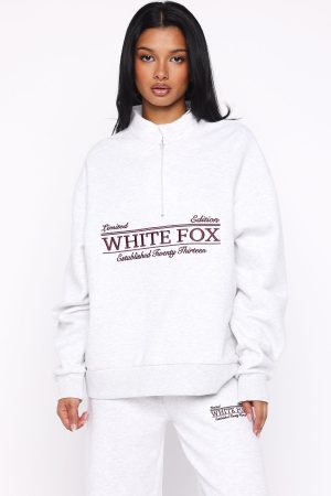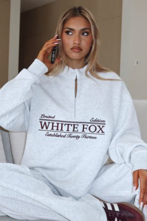 Lounge life just got a whole lot cuter. The Standing My Ground Zip Front Sweater Grey Marle is designed with slouched shoulders and ribbed hems which round out an oversized silhouette. Featuring long sleeves. front quarter zipper closure. and an unlined fleece interior. this hoodie delivers a cozy feel. White Fox embroidered text embellishes the centre front. Style with Standing My Ground Wide Leg Sweatpants or Standing My Ground Lounge Shorts.