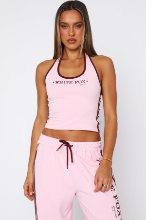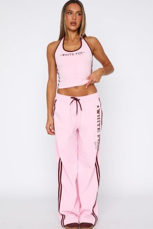 This colour combo makes casual look instantly cool! The Star of the Night Halter Top in Pink features fixed halter strap. a scoop neckline. fitted silhouette. backless with maroon trim and side stripes. Finished off with bold White Fox text centre front. Have a five star quality fit by pairing with the matching Star Of The Night Track Pants in Pink.