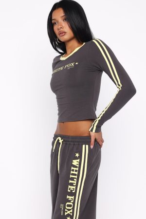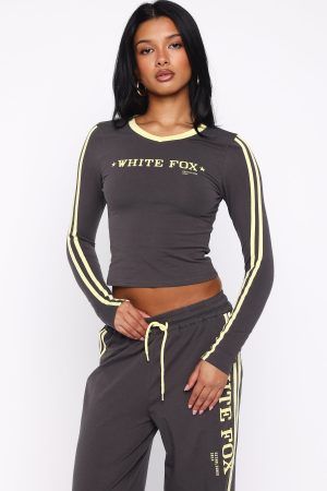 Effortlessly cool and perfectly coordinated. the Star Of The Night Long Sleeve V-Neck Baby Tee in Charcoal features a subtle V-neckline. long sleeves with double stripe detailing. and a fitted silhouette. The printed White Fox text at the centre front adds a touch of signature style. and the unlined high-stretch fabrication ensures comfort. Style with the matching Star Of The Night Track Pants Charcoal.