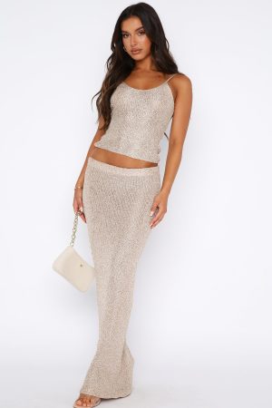 Shine all night long in the Star Shining Sequin Maxi Skirt in Champagne. This knitted maxi skirt features a high. elasticated waistband and sequin embellishment. Complete the look with the matching Love Galore Sequin Top and perspex heels for a look that will have heads turning!