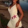 Float through Summer in the Starborn Mini Dress in White. Features halter self tie straps. cowl neckline. backless. lined fabric and starfish beaded design on side front. Complete this dreamy look with a pair of kitten heels and gold accessories.