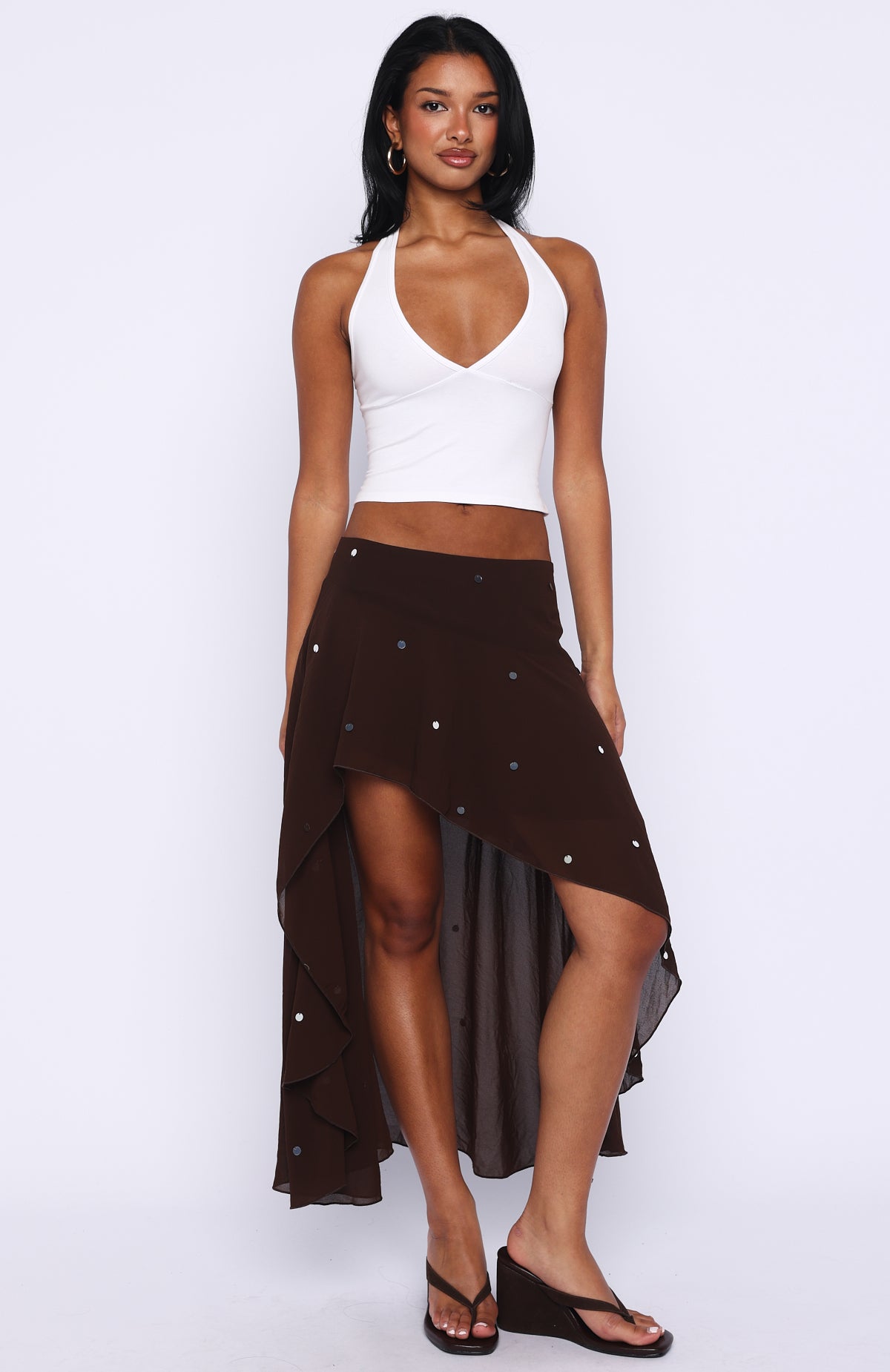 Simply perfect! The Starry Eyed Sequin Midi Skirt in Chocolate features a fixed waistband and flattering asymmetrical high-to-low hem with scattered sequins for shimmering movement. Finished with a zipper and hook-and-eye closure. It’s your go-to for standout occasion style when paired with a basic tank and kitten heels.