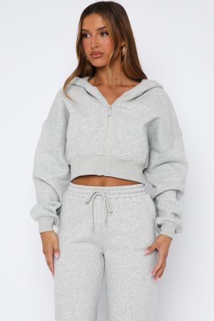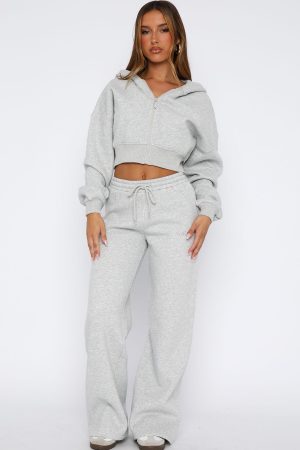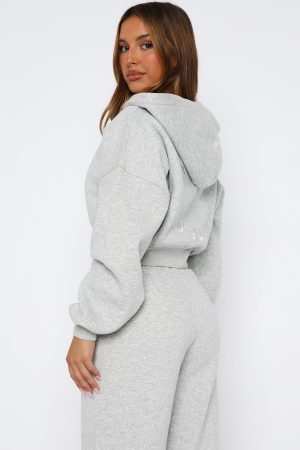 Get cosy in the Stay Lifted Cropped Hoodie in Grey Marle. Features hood. front zipper. White Fox embroidered logo centre front and back. long sleeves with ribbed cuff at sleeve. cropped length with ribbed hemline for a cosy fit. Complete the look with the Stay Lifted Wide Leg Sweatpants in Cinnamon for a look we love!