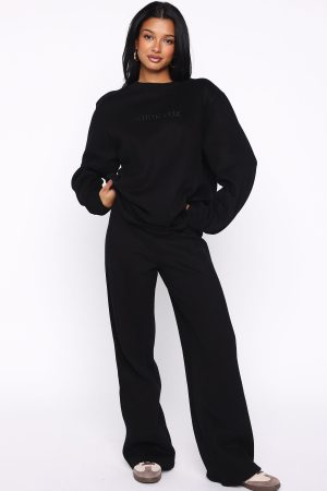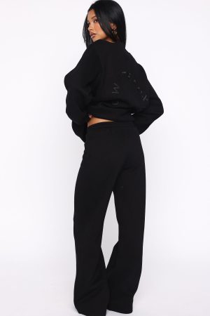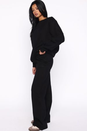 Lounge season every season! The Stay Lifted Wide Leg Sweatpants in Black feature an oversized fit. elasticated waistband with external drawstring. pull on construction. embroidered White Fox text at side front and fleece interior. Have a matching moment by pairing with the Stay Lifted Oversized Sweater in Black.