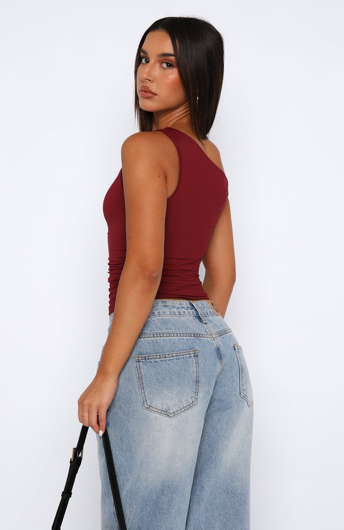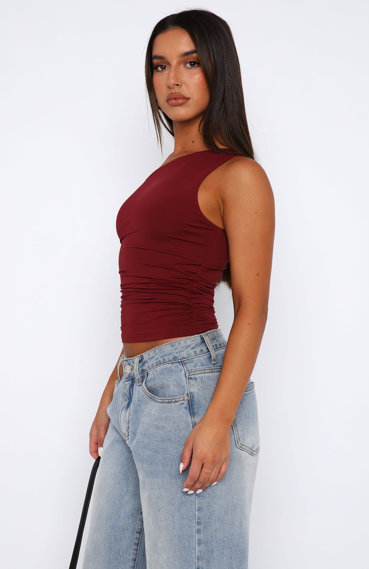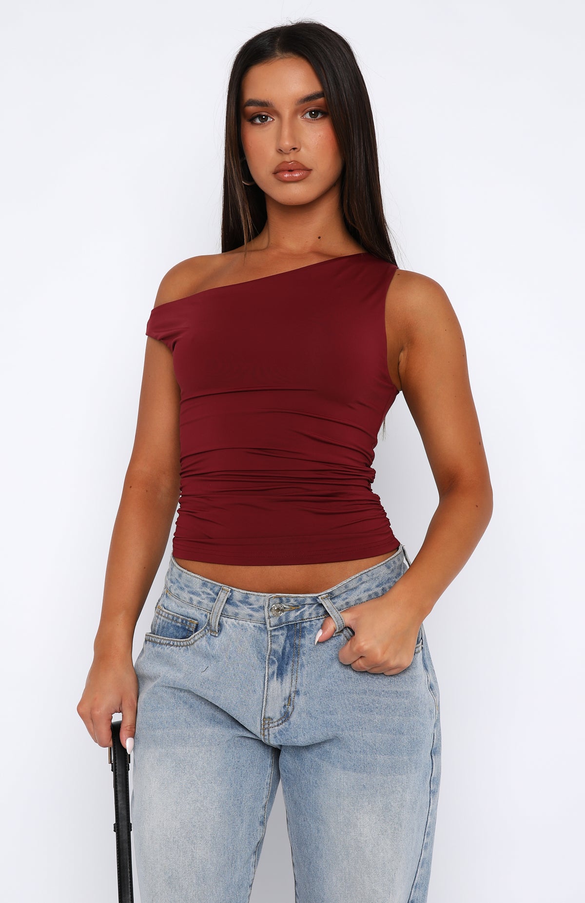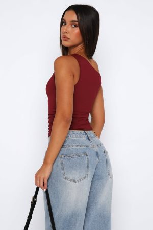 Ruched detailing is our favourite trend right now. The Stay With You Top Wine features a one shoulder design. ruched side design. slinky and soft fabric made to slip on with ease. The Stay With You Top in Wine is an elevated basic your wardrobe is calling out for!