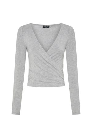 The Staying Cute Long Sleeve Wrap Top in Grey Marle is a dreamy layering piece that effortlessly blends comfort with style. Crafted from slightly sheer. unlined fabric with a touch of stretch. it features a flattering V-neckline. long sleeves. and self-tie straps for a customisable fit. Pair with a matching active set for a look we love.