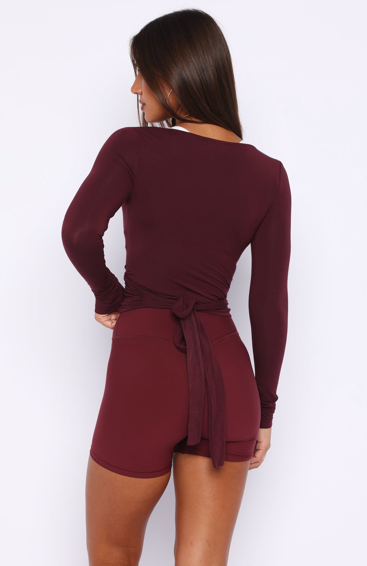 The Staying Cute Long Sleeve Wrap Top in Merlot is a dreamy layering piece that effortlessly blends comfort with style. Crafted from slightly sheer. unlined fabric with a touch of stretch. it features a flattering V-neckline. long sleeves. and self-tie straps for a customisable fit. Pair with a matching active set for a look we love.