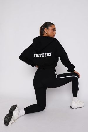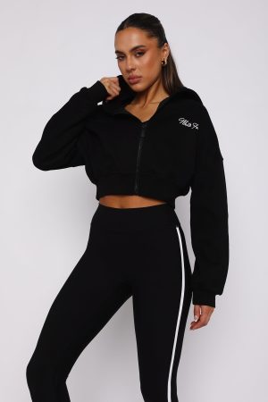 The new best part of your daily ritual: slipping on the Stepping Out Cropped Hoodie Black. Features a cropped length. oversized fit and features elasticated ribbed cuffs & hem. hood. zip fastening. soft fleeced fabric for extra comfort and side front and centre back printed logo. Complete the look with bike shorts and sneakers for a comfy and cosy look!
