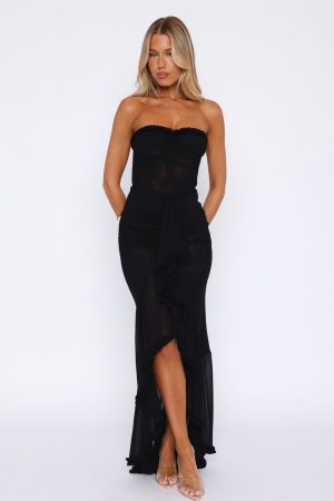 Leave a lasting impression at your next event in the Still Got It Mesh Maxi Dress Black! Featuring a strapless design with gel grip at bust and ruched detailing. figure-hugging fit at bodice. centre front frill design. mesh lined and back. invisible zipper and clasp closure. Complete the look with kitten heels and simple gold jewellery for a look we love!