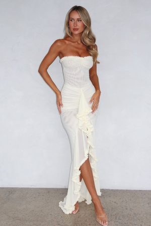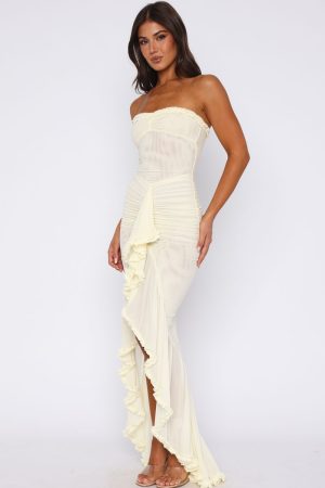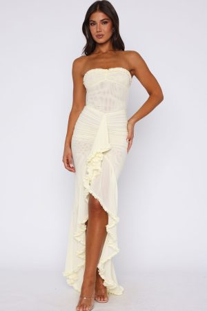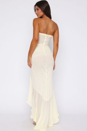 Leave a lasting impression at your next event in the Still Got It Mesh Maxi Dress in Lemon! Featuring a strapless design with gel grip at bust and ruched detailing. figure-hugging fit at bodice. centre front frill design. mesh lined and back. invisible zipper and clasp closure. Complete the look with kitten heels and simple gold jewellery for a look we love!