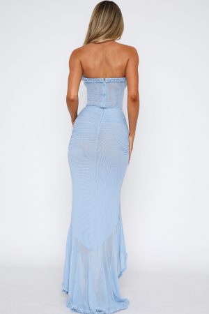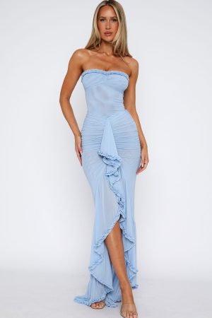 Leave a lasting impression at your next event in the Still Got It Mesh Maxi Dress Sky Blue! Featuring a strapless design with gel grip at bust and ruched detailing. figure-hugging fit at bodice. centre front frill design. mesh lined and back. invisible zipper and clasp closure.