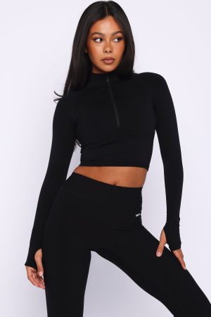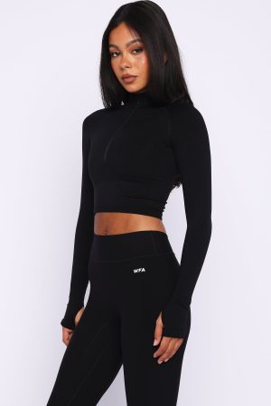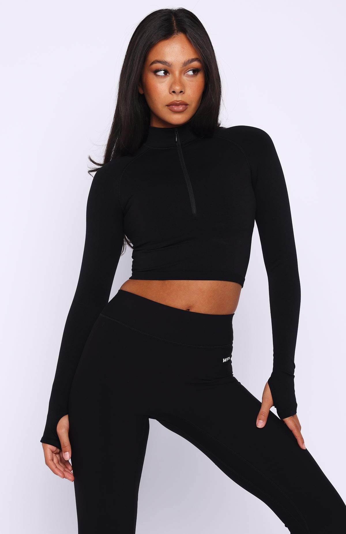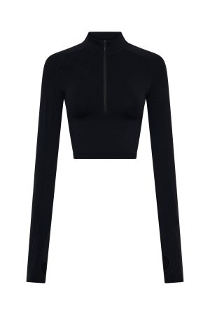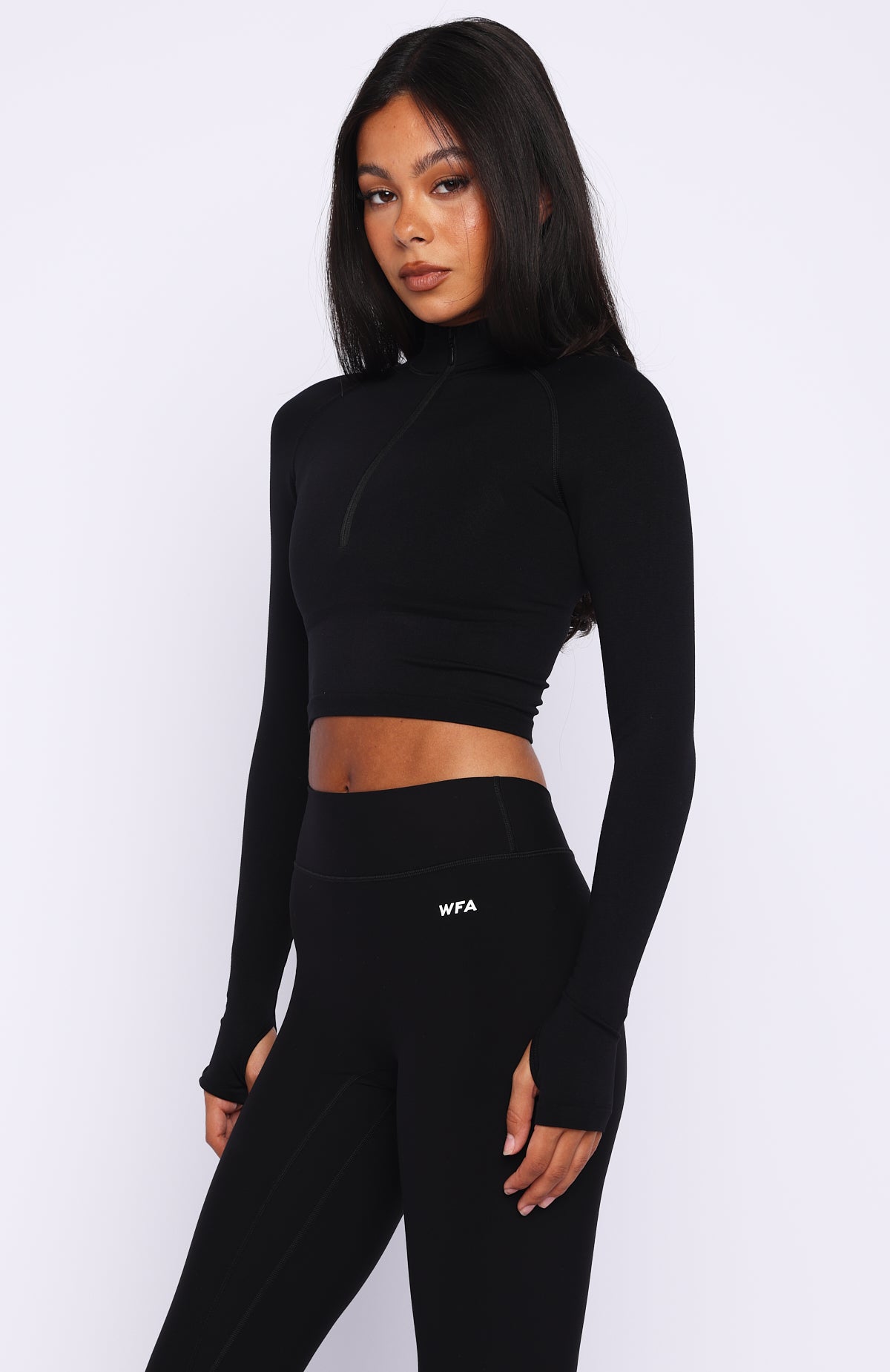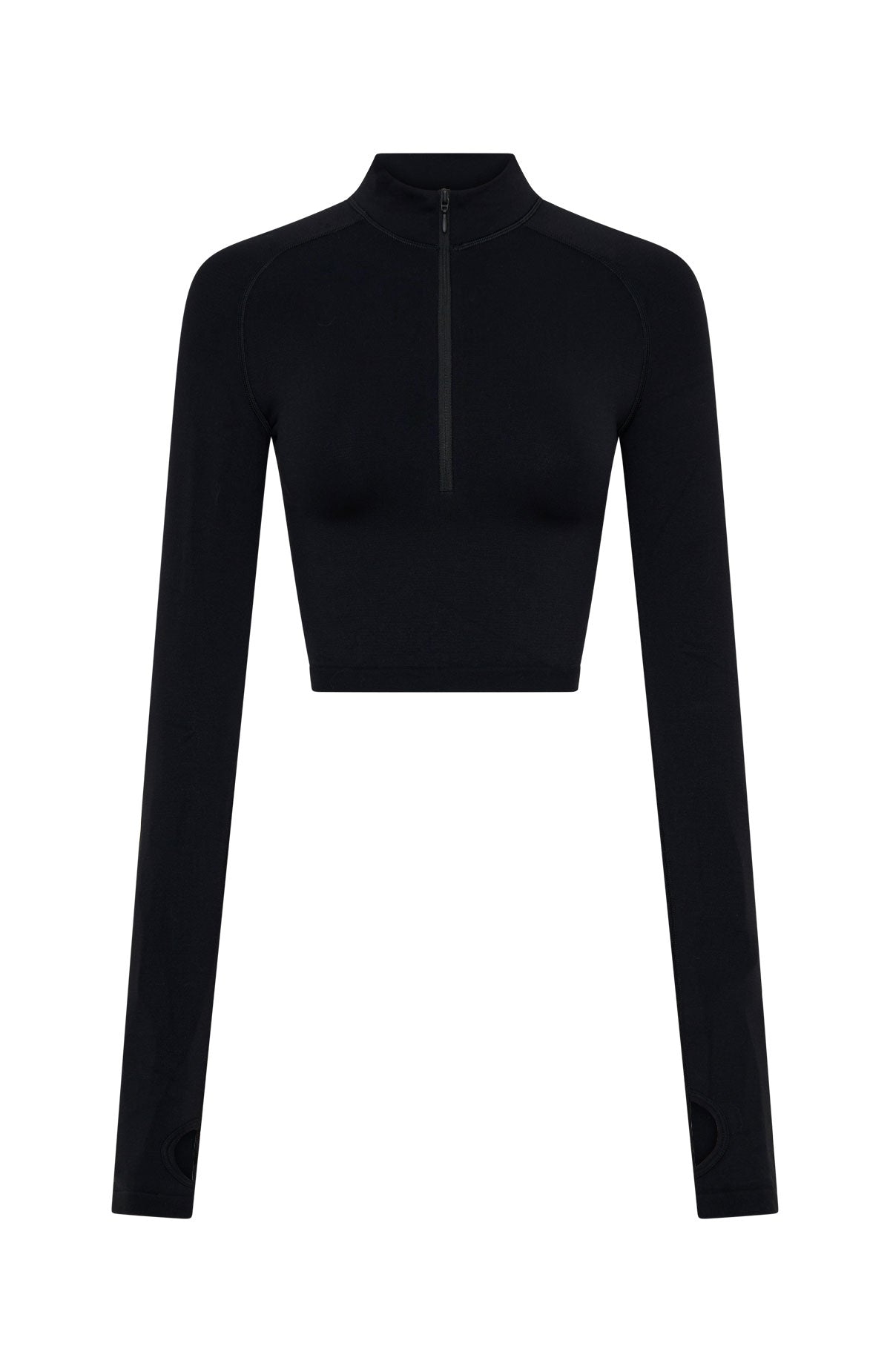 My kind of addiction. The Stride Seamless Zip Long Sleeve in Black features a high neckline. long sleeves with a quarter‑zip center front. high‑stretch seamless fabrication. an unlined design. and a cropped silhouette. Style with the matching bottoms in Black to take on any exercise.