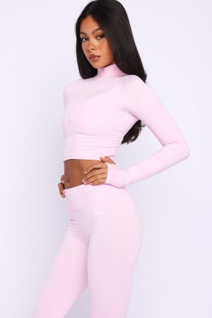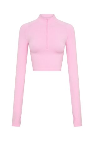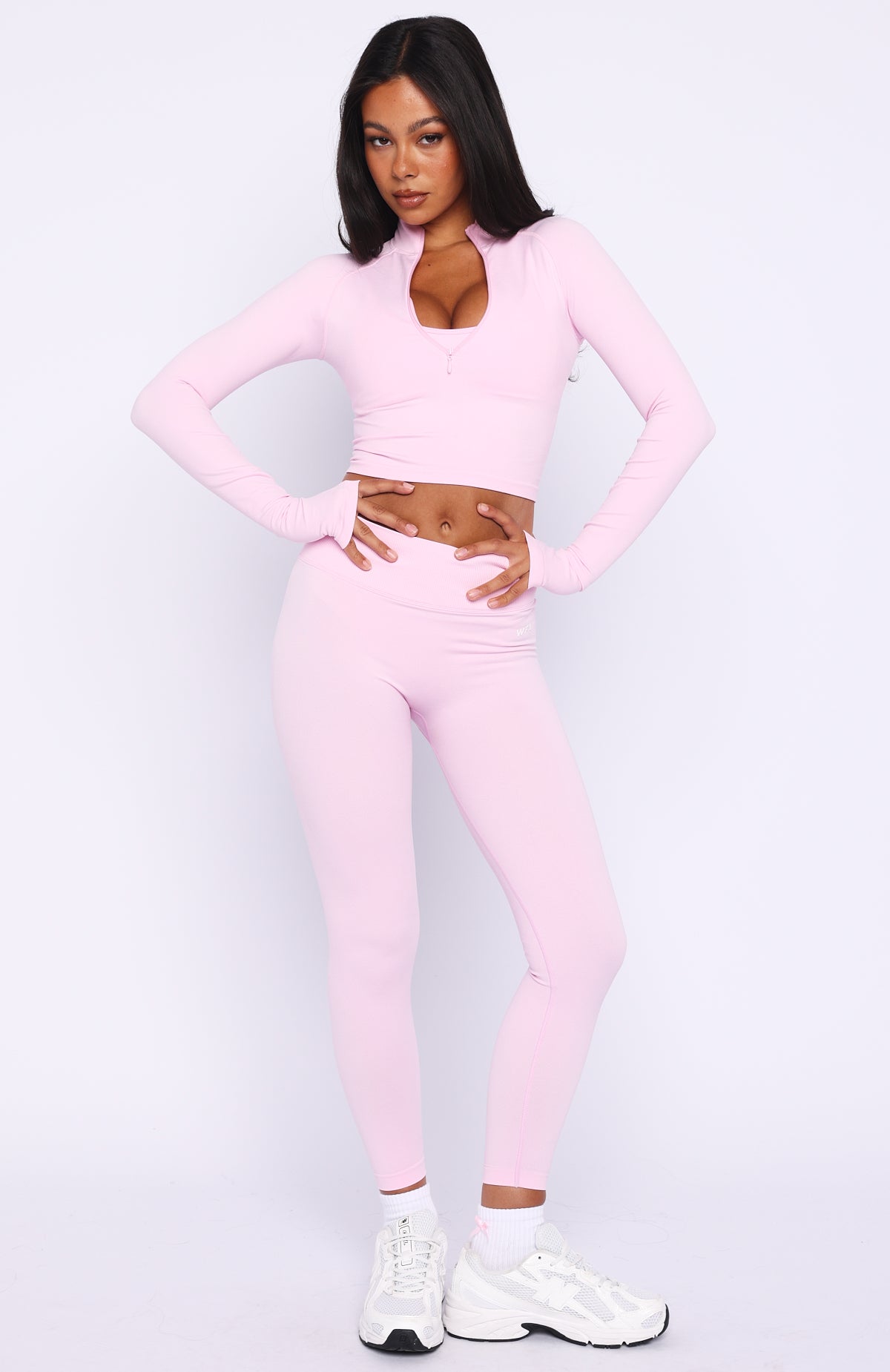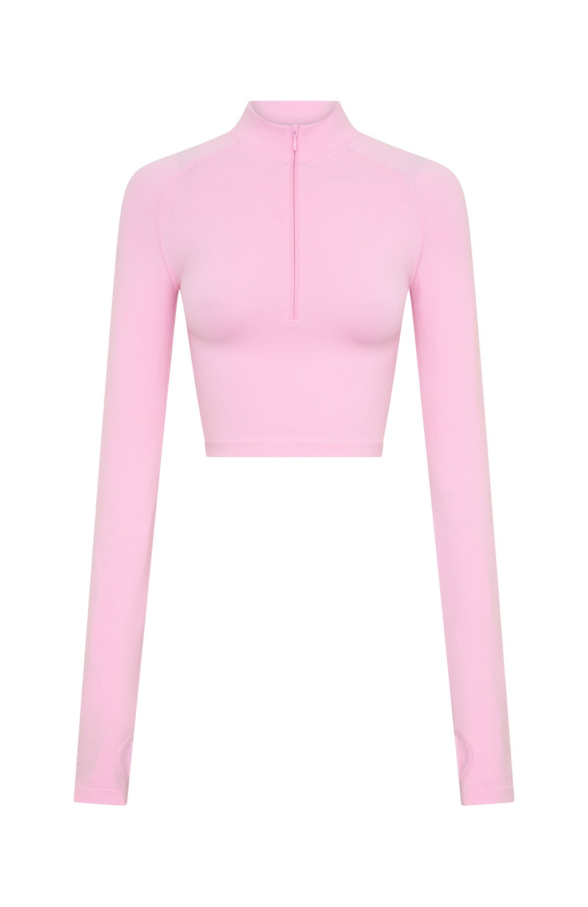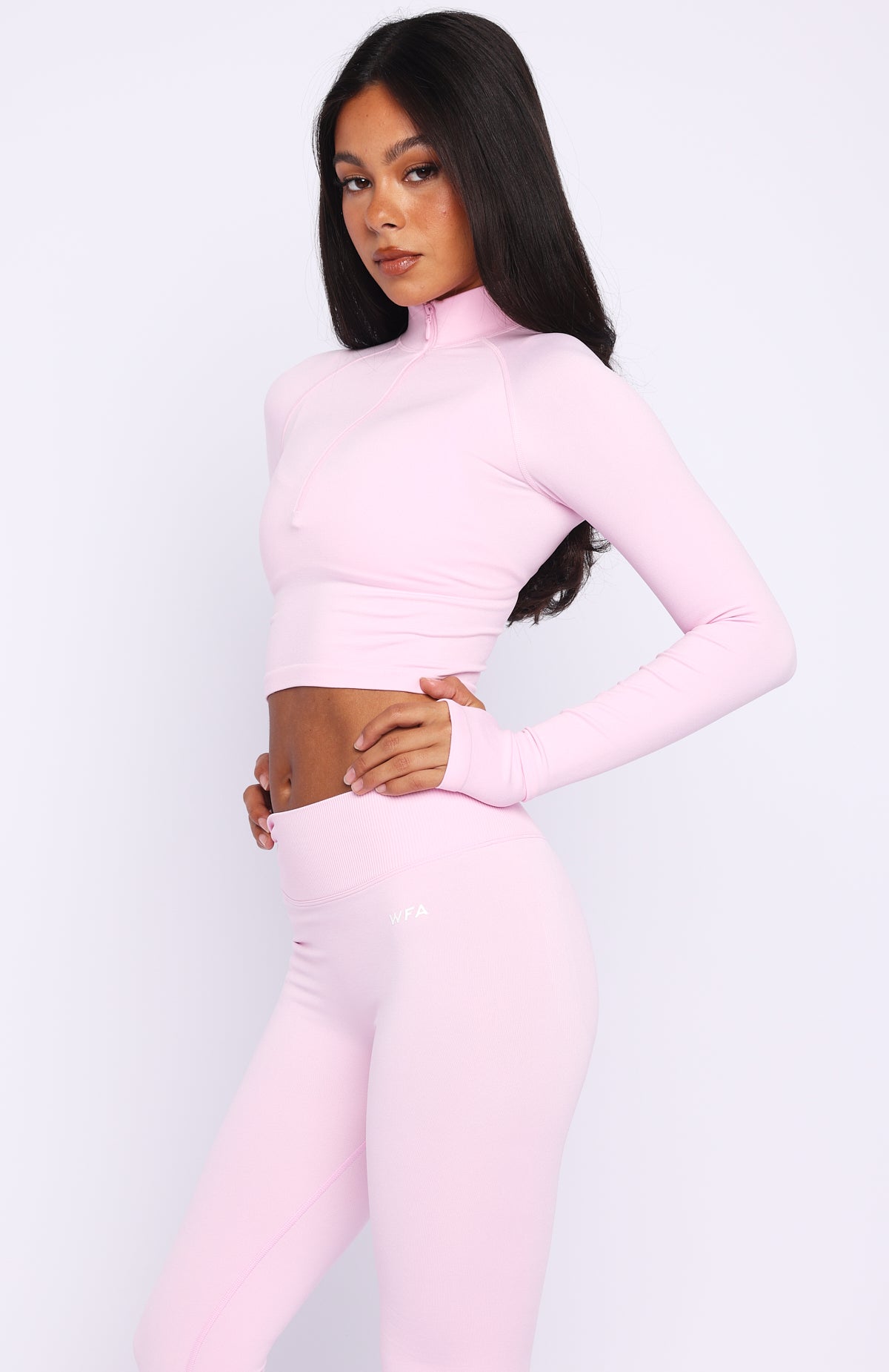 My kind of addiction. The Stride Seamless Zip Long Sleeve in Marshmallow features a high neckline. long sleeves with a quarter‑zip center front. high‑stretch seamless fabrication. an unlined design. and a cropped silhouette. Style with the matching bottoms in Marshmallow to take on any exercise.