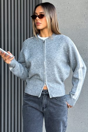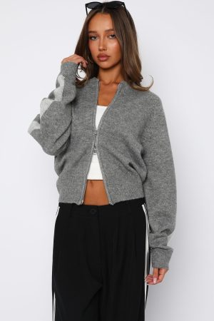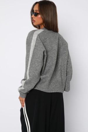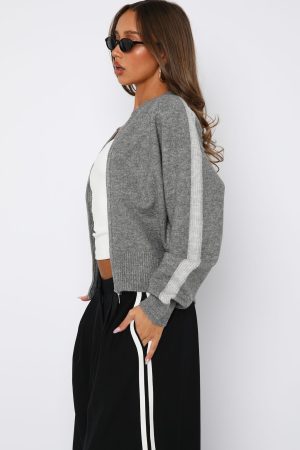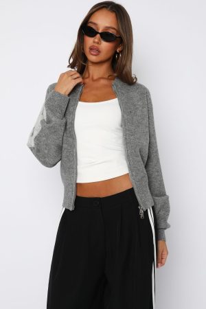 Embrace effortless style with the Stripe Me Down Knit Jacket in Charcoal/Grey. Featuring a crew neckline. slouched shoulders. and long sleeves with ribbed cuffs. this jacket offers a relaxed fit perfect for layering. The subtle stripe detailing on the sleeves adds a touch of interest. while the double zipper closure ensures versatility. Ideal for pairing with denim or lounge pants. this piece brings a Pinterest-worthy vibe to your wardrobe.