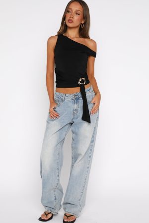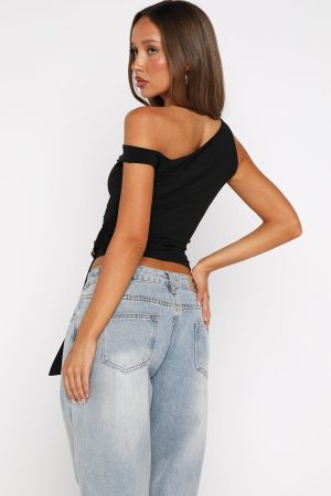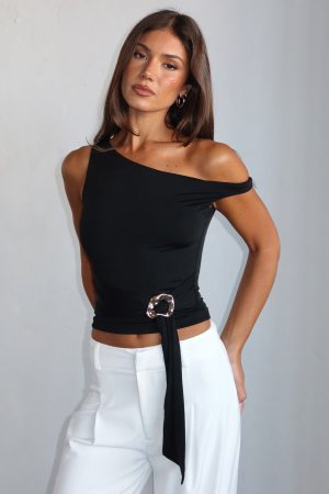 Your new Stuck In A Dream Off Shoulder Top in Black is waiting for you! Features an off-the-shoulder neckline. a sleek bodice. and a draped sash at the waist adorned with gold hardware detailing. Crafted from high-stretch fabric and fully lined. it offers both comfort and a flattering silhouette. Style with tailored pants. kitten heels and layered gold jewellery for a chic fit.