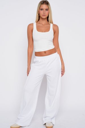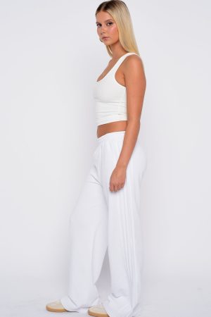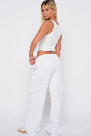 Vibe: street style chic. The Stuck In The City Track Pants in White feature a thick elasticated waistband. wide-leg silhouette. and sporty double-stripe piping down the sides. With an unlined. loop-back interior. they offer relaxed comfort with sleek edge. Style with with a basic top. statement sneakers and shoulder bag for the perfect street style fit!