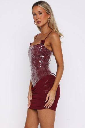 Step into the spotlight and let the fun begin with the Studio Starlet Sequin Mini Dress Wine! Featuring thin. adjustable shoulder straps with attached flower detailing. lined material. invisible side zipper and clasp closure. back corsetry-inspired lace-up design. sequin embellished material for a high shine look. and front overlay cowl detailing at the skirt. Style with a heel and layered gold jewellery for a bday look we love.