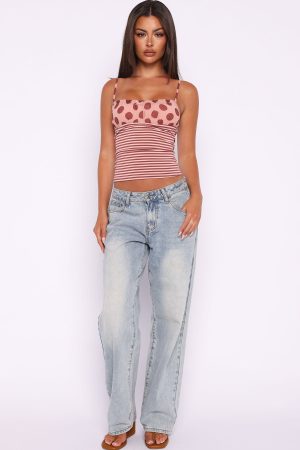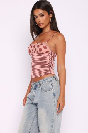 The Sucker For You Top Pink Stripe features thin. adjustable shoulder straps. lined at the bust with the cutest polka dot material overlay and bow detailing. and stretch material for an easy slip on design. Pair it with your favourite low rise denims and slip ons for the ultimate warm weather vibe!