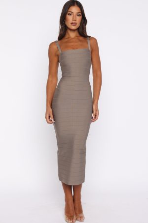 Effortlessly chic. the Sugar And Spice Midi Dress in Mocha features thick shoulder straps. a figure-hugging fit. and panel detailing. Crafted from a slight stretch material. it offers comfort and style. Pair with kitten heels and gold jewelry for a glamorous look.