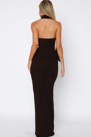 Drape yourself in confident glamour with our Sugar High Maxi Dress in Chocolate! Features a one shoulder neckline with attached neck scarf. figure hugging silhouette. backless and lined. Finish this striking dress with kitten heels and simple gold jewellery. for a look we love!