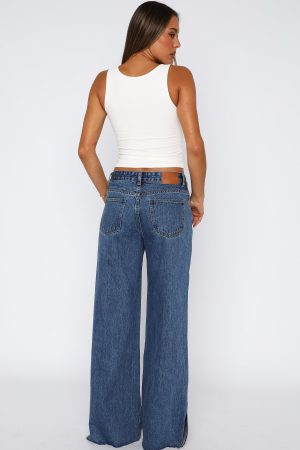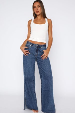 Make it a night to remember in the Summer Mid Rise Wide Leg Jeans Admiral Blue. Features a mid rise fit. wide leg design. front zipper and button closure. 5 pocket design. raw hem with side split detailing and full length. Style with your favourite basic crop and a statement belt!