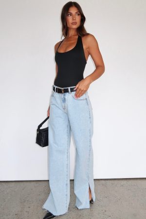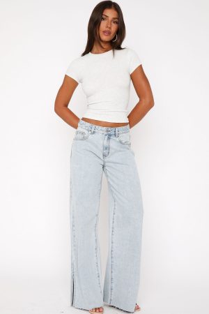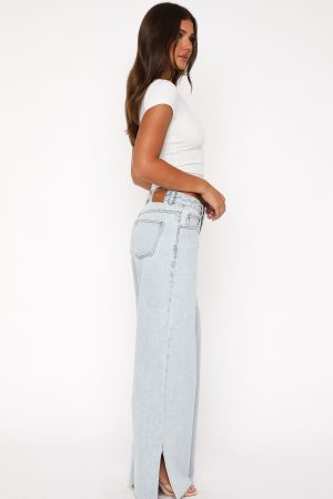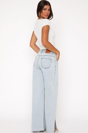 Make it a night to remember in the Summer Mid Rise Wide Leg Jeans Glacier Blue. Features a mid rise fit. wide leg design. front zipper and button closure. 5 pocket design. raw hem with side split detailing and full length. Style with your favourite basic crop and a statement belt!