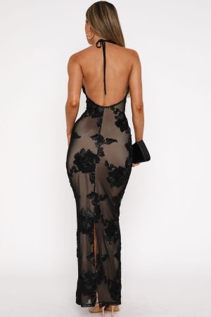 Get ready to wow at your next event with our Summer Ready Maxi Dress in Black! Featuring a halter neck design with self tie straps. backless. scooped neckline. maxi length. lined. invisible back zipper and clasp closure. and high back split detailing. Style with perspex heels and gold accessories!