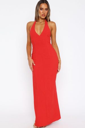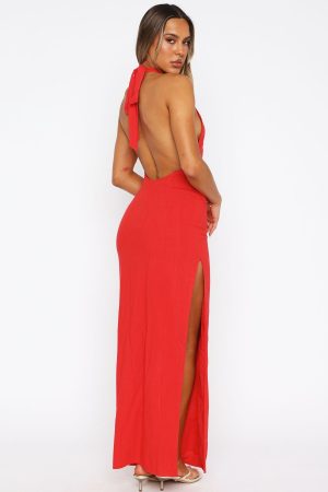 A flirty. fuss-free dress that still does all the talking! The Sun Kissed Glow Maxi Dress Red features a halter style neckline with thick tie-up straps at back. hidden side zipper with hook & eye. high cute side split hemline. lined fabric. open back design. low v-neckline and hugging fit. We’re in love!