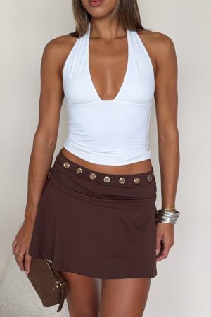 We’re dedicated to the details! The Sunset Avenue Mini Skirt in Chocolate features an eyelet design. a flattering mini fit. and delicate pleats at the hem. Made with comfortable stretch and fully lined for a smooth finish. it’s designed to fit and flatter. Pair it with a bustier and kitten heels for an on-trend look we love.