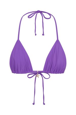 No shoes no shirt just the Sunset Bay Bikini Top Grape. no problem! Featuring self-tie halter straps. a classic triangle silhouette. and an adjustable back strap for a tailored fit. Finished with a delicate shell-gold charm at the front for a touch of seaside sparkle. Style it with the matching Grape bottoms and layer on gold jewellery for that golden-hour summer glow.