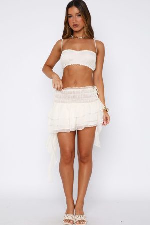Enjoy a beach picnic in Sunset Stories Top in White! Features thin adjustable straps. square elasticated neckline. ruffle hem detailing. cutest little bow centre front and lined. Pair with the Sunset Stories Mini Skirt and enjoy the sky full of colour!