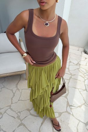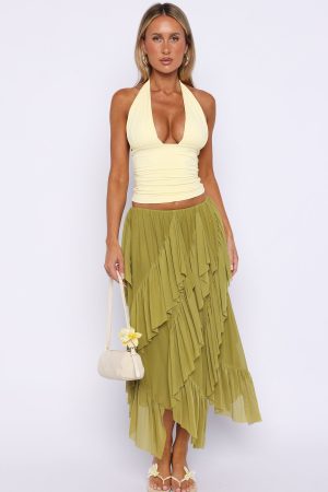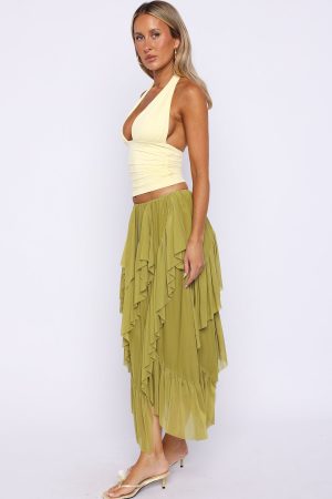 Float through summer in the Sunset Strolls Midi Skirt in Matcha. It features a thin elastic waistband. soft asymmetrical ruffle detailing and high-stretch fabrication that moves with you. all fully lined for comfort. Style it with a simple tank. kitten heels and sunnies for an effortless. chic warm-weather look.