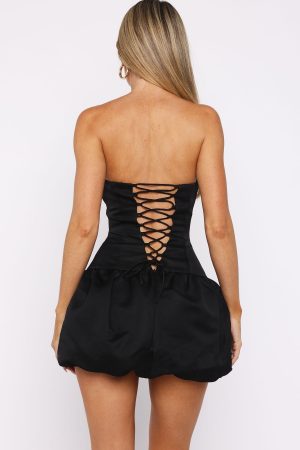 Make an entrance this holiday season in the Sunshine Serenade Mini Dress Black! Features a strapless design. grip-tape. drop-waist fit bodice. structured and thick. lined fabric. gathered bubble skirt design with elastication at hemline for a secure fit. hidden centre back zipper with hook & eye at skirt and a lace up back design with adjustable ties for a desired fit. Style with layered gold jewellery and heels for a xmas day statement.