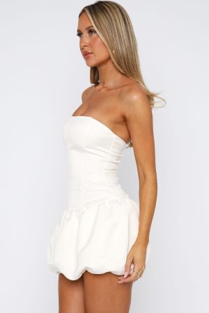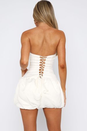 Make an entrance this homecoming season in the Sunshine Serenade Mini Dress Cream! Features a strapless design. grip-tape. drop-waist fit bodice. structured and thick. lined fabric. gathered bubble skirt design with elastication at hemline for a secure fit. hidden centre back zipper with hook & eye at skirt and a lace up back design with adjustable ties for a desired fit.