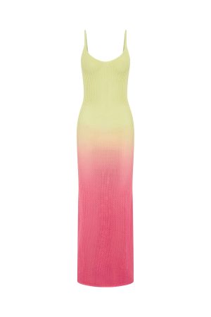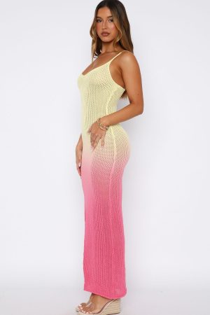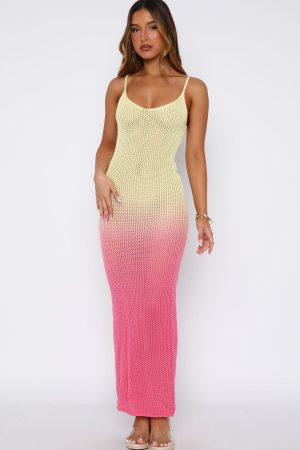 The Sunshine Soul Crochet Maxi Dress in Lemon/Pink Ombre is your newest go to for beach sunset dinners! Features thin adjustable straps. round neckline and stunning ombre fabrication. Complete the look with statement heels and colourful shoulder bag for a fab fit!