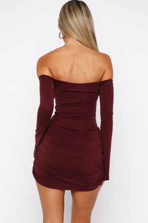 Romantic silhouettes. The Sweet Provence Long Sleeve Mini Dress in Port features an elasticated strapless neckline. flared long sleeves. and a draped skirt with side ruching. Fully lined and crafted from high-stretch fabric. this dress offers both comfort and style. Pair with simple heels and layered gold jewellery to let the dress do all the talking.