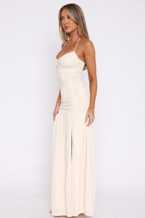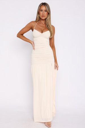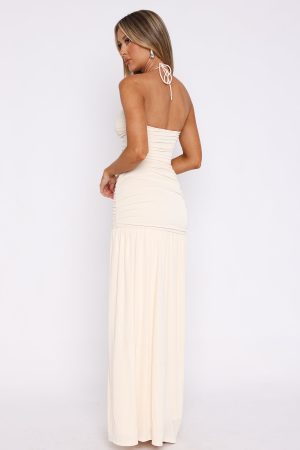 A vacay dream! The Sweet Skies Maxi Dress Cream features a halter style neckline with thin self-tie straps. low cut neckline. front ruched bust detail and dress bodice. hugging silhouette. maxi drop skirt with high cut split hem design. lined fabric. and stretch for a slip on design. Pair with kitten heels and simple accessories to let the dress do all the talking.