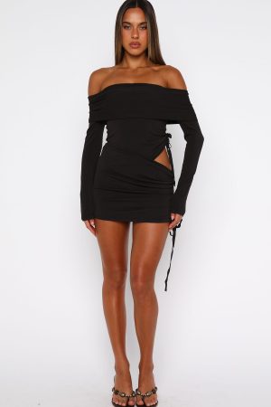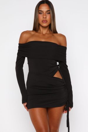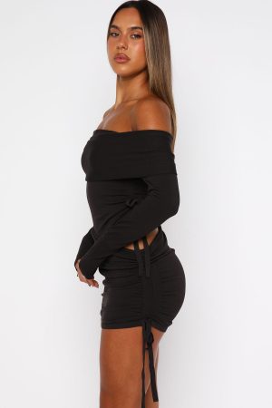 Cold weather. hot wardrobe. The Sweet Sting Long Sleeve Mini Dress Chocolate features a strapless fold-over neckline with elastic support. long sleeves. a fitted silhouette with side drawstring ruching at the bodice and skirt. a hip cut-out. elastic waist and a high-stretch ribbed fabric. Style it with sleek heels and layered gold jewellery for an effortlessly stunning outfit.