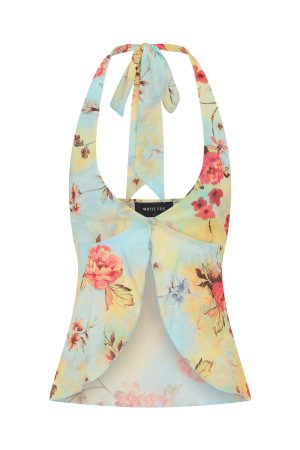 Be a trendsetter in the Sweet Tea Halter Top in Spring Dream. Features a halter style neckline with back self-tie straps. plunge neckline with front button closure. open midriff design. lined at bust only. cropped fit. sheer fabric and gorgeous printed fabric. We love this paired with the matching Twice Shy Mini Skirt in Spring Dream.