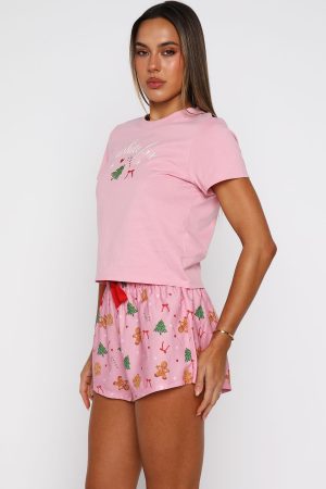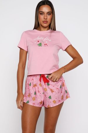 Sleigh the season in cozy style with the Sweetheart Pyjama Set in Candy Kiss. This set features a classic crew neckline. short sleeves. and cropped length top with a cute WF logo at the centre. Paired with matching shorts. featuring a thick elasticated waistband and drawstring. it’s perfect for Christmas morning lounging or gifting under the tree.