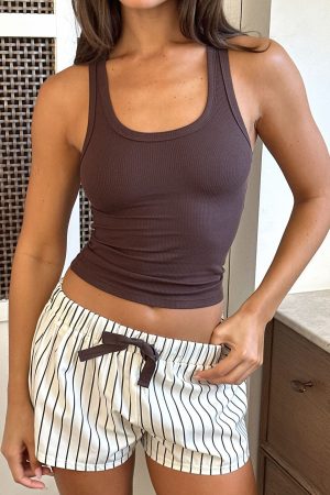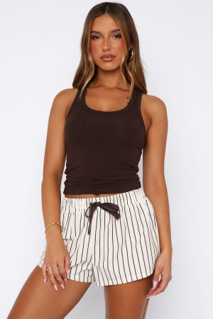 Make your bedtime routine a little sweeter with the Sweetheart Pyjama Short Cream/Choc Stripe! Features a thick elasticated waistband with self tie string. two side pockets. straight leg and unlined. lightweight material. Cosy up and pair with the No Peace Racer Back Pyjama Top!