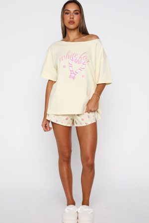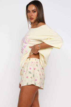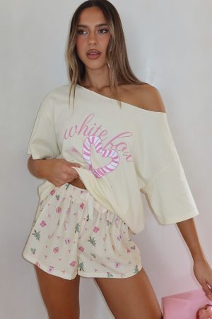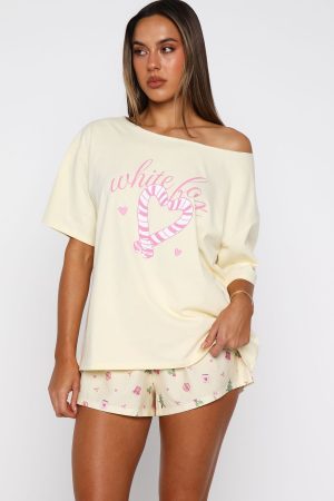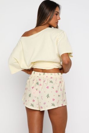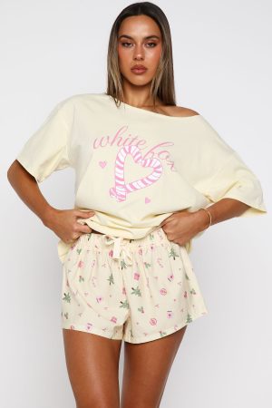 The Sweetheart Pyjama Short in Festive Flicker adds a festive touch to your bedtime routine. Designed with a thick elasticated waistband. self-tie drawstring and Christmas inspired pattern. The straight-leg cut and unlined. lightweight material provide breathability and ease. Pair it with the Sweetheart Pyjama Off Shoulder Tee Lemon.